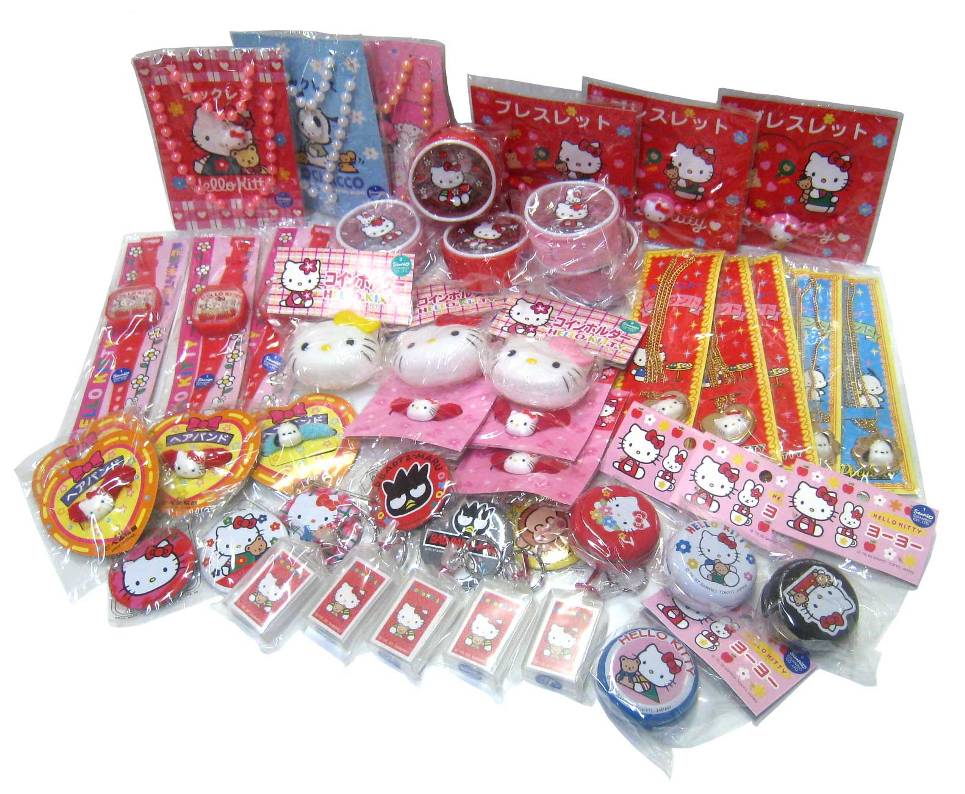 日本Sanrio各种各様商品組合 Sanrio各种各様商品組合 多种混入;300個入 Sanrio角色商品(几乎是糖果型的玩具),裝飾品的組套的安排! 在代理公司内,是真地很难見的機低価銷售、必須做CHECK